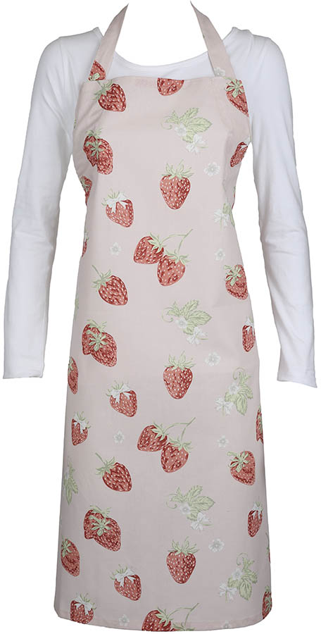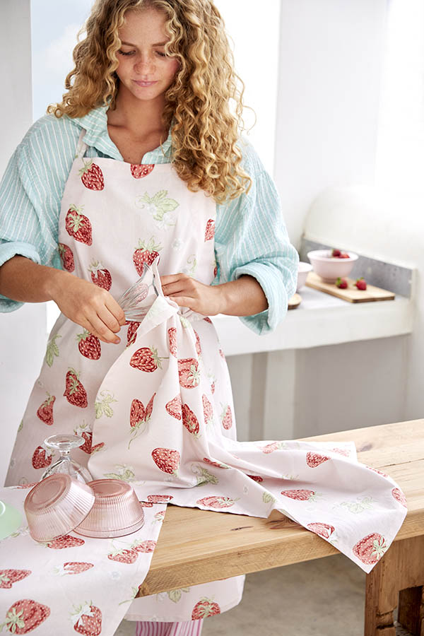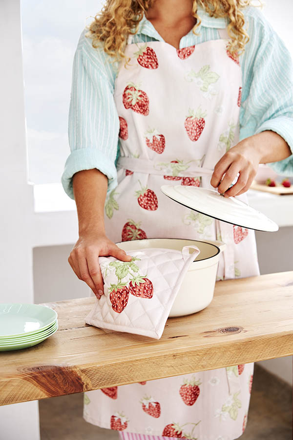 Rosa forkle med jordbærprint og søt rysjekant. Mønsteret gir kjøkkenet en sommerlig stemning og passer like fint på hytta som hjemme.