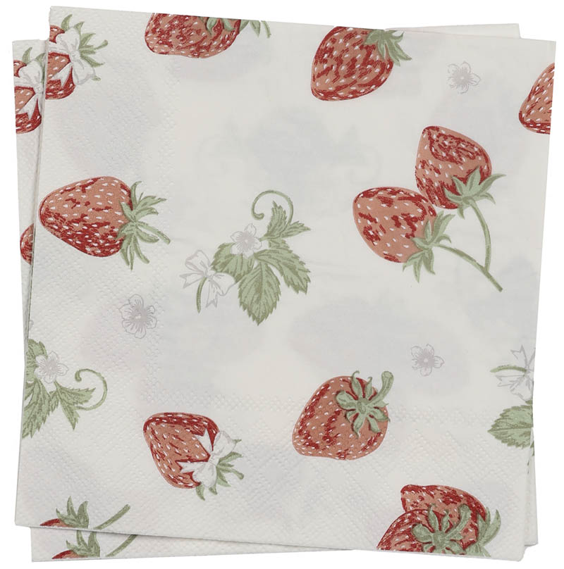 Papirservietter med klassisk jordbærmønster. Det søte motivet gir borddekkingen et sommerlig og nostalgisk preg.