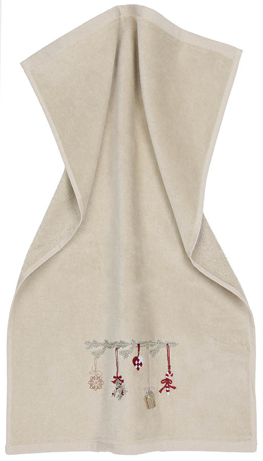 Nydelig gjestehåndkle i myk velour, brodert med en vakker girlander og klassiske juleornamenter. Det koselige motivet skaper en lun og nostalgisk julestemning på badet.
