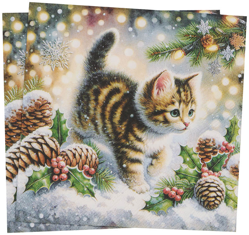 Papirservietter med et nydelig motiv av en søt katt. Det koselige designet passer til alle høytidens måltider – fra frokost til middag. Serviettene er også perfekte som gave.