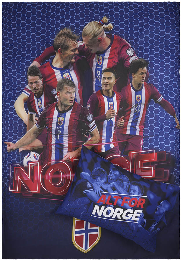 Motivet viser kjente profiler som Antonio Nusa, Oscar Bobb, Erling Haaland, Martin Ødegaard, Alexander Sørloth og Sander Berge – et drømmesengesett for barn og ungdom som elsker fotball.