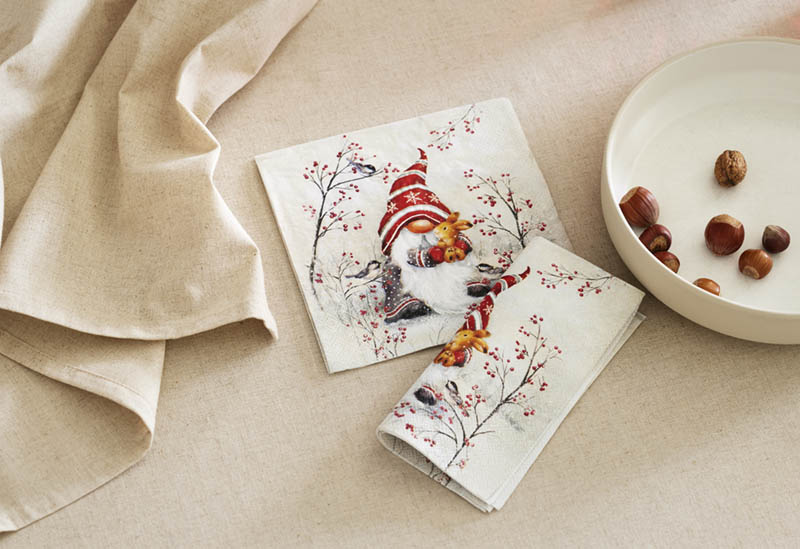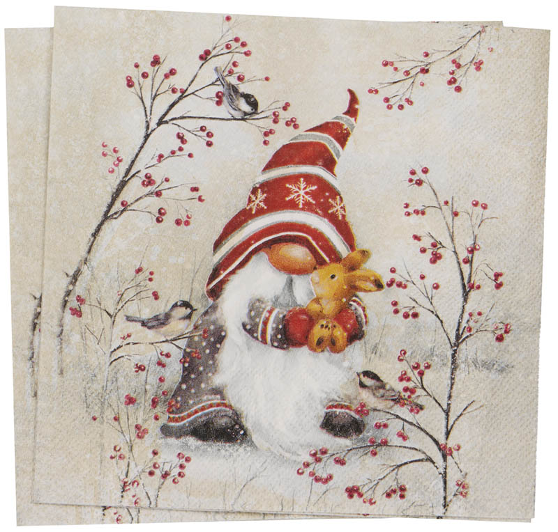 Papirservietter med motiv av en søt nisse i snøkledd skog. Det koselige designet gir garantert julestemning – enten du skal dekke bordet til frokost, lunsj eller middag i høytiden. Serviettene er også en flott, liten gave som sprer juleglede. Kombiner gjerne med fyrstikkesken fra samme serie.