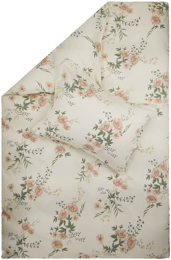 Mykt og behagelig sengesett i bomullssateng. Sengesettet har et iøynefallende floralt mønster som gir soverommet et romantisk preg. Putevaret har en elegant vinge langs kanten som en ekstra detalj. Perfekt for deg som vil kombinere komfort med vakker design.
