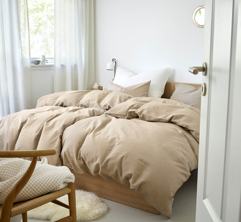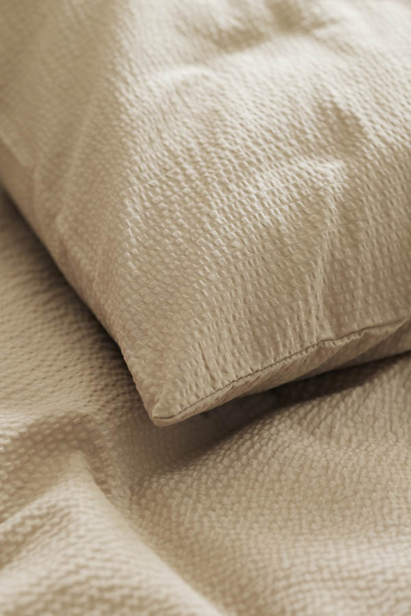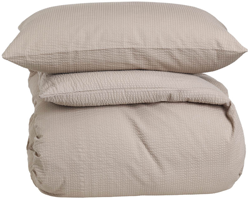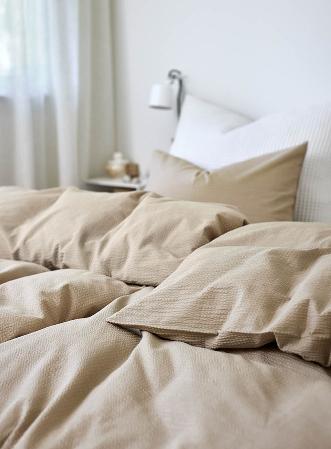Ensfarget sengesett i sval bomullskrepp. Det bølgete stoffet føles lett og luftig mot huden, mens den tidløse beigefargen enkelt kan kombineres med annet interiør på soverommet. Et populært design som fås i flere fine farger.