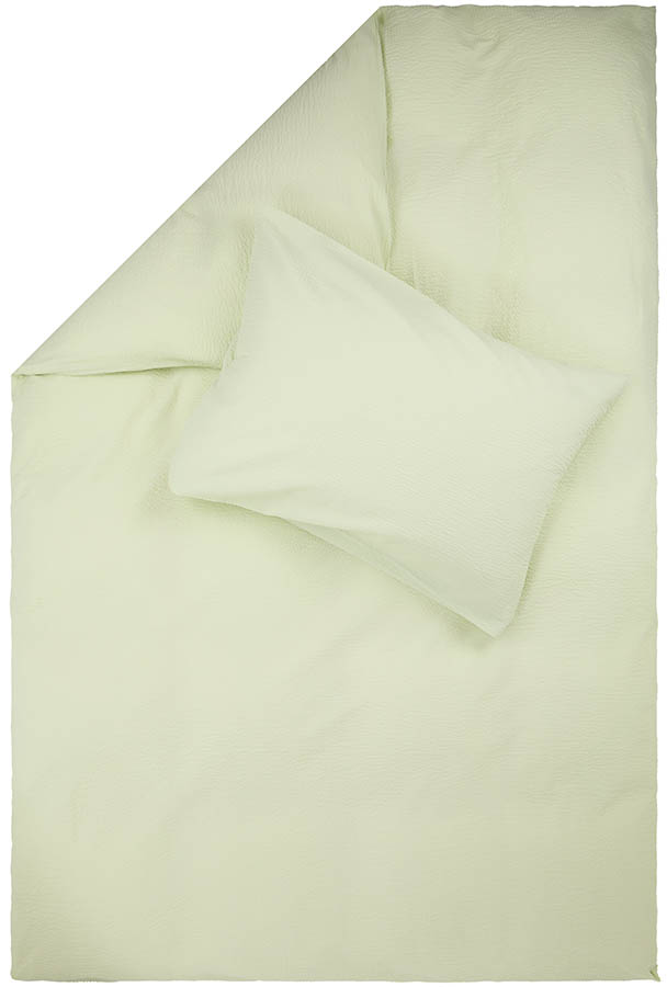 Ensfarget sengesett i sval bomullskrepp. Det bølgete stoffet føles lett og luftig mot huden, mens den grønne fargen gir soverommet et delikat og vårlig uttrykk. Et populært design som fås i flere fine farger.
