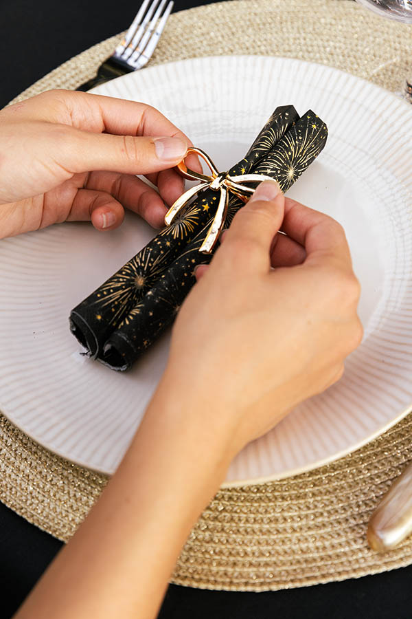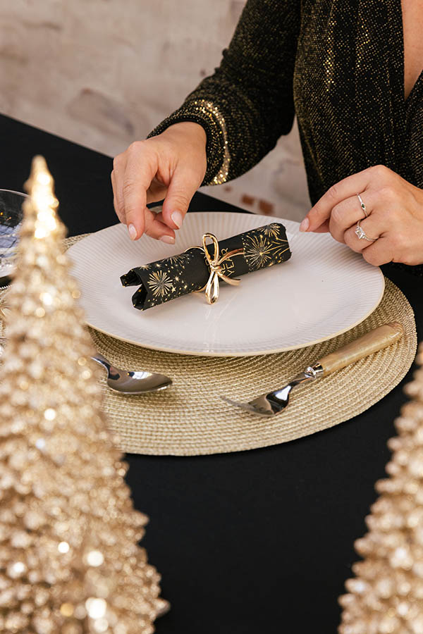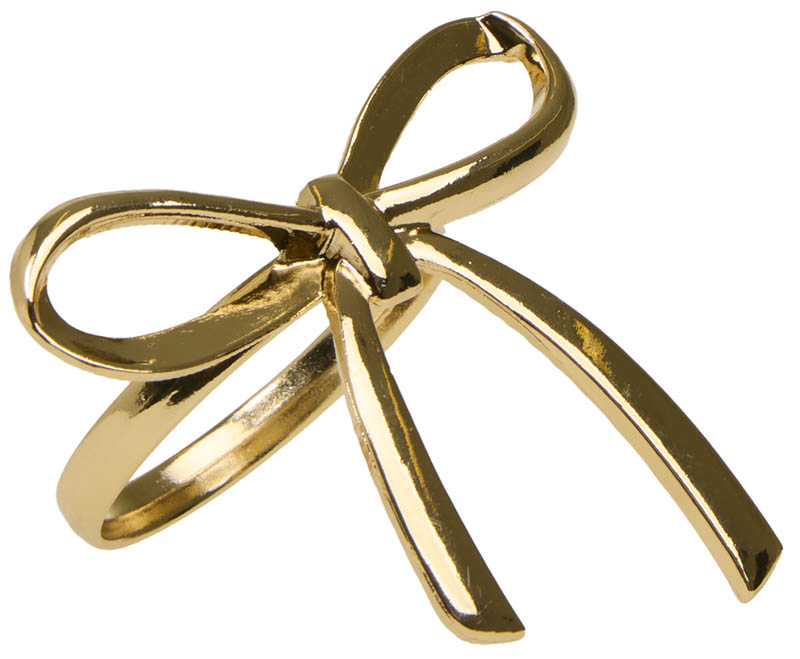 Enkel og elegant serviettring med sløyfe på toppen. Det delikate designet gir bordet et sofistikert preg, og den gyldne fargen skaper et festlig blikkfang. Perfekt til tøyservietter, men kan også brukes til papirservietter. Like fin til julebordet som til nyttårsbordet.
