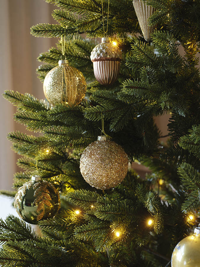 Gylden juletrekule i glass. Formet som en nøtt med et dryss av glitter på toppen. Et design inspirert av skogen. Vakker i juletreet, hengende i vinduet eller som bordpynt. Også fin på et fat, i miks med ekte nøtter, kongler og andre skatter fra naturen.