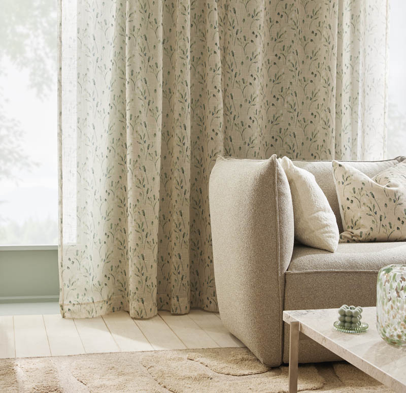 Mellomtykk gardin med grønt stråmønster på lysbeige bunn. Lettstelt kvalitet og vakkert fall. Mønsteret er delikat og diskret, samtidig som det skaper en fin effekt i vinduet. Et naturinspirert design som gir en lun og behagelig atmosfære i rommet. Gardinen henges opp med rynkebåndskroker, enten på stang eller skinne.