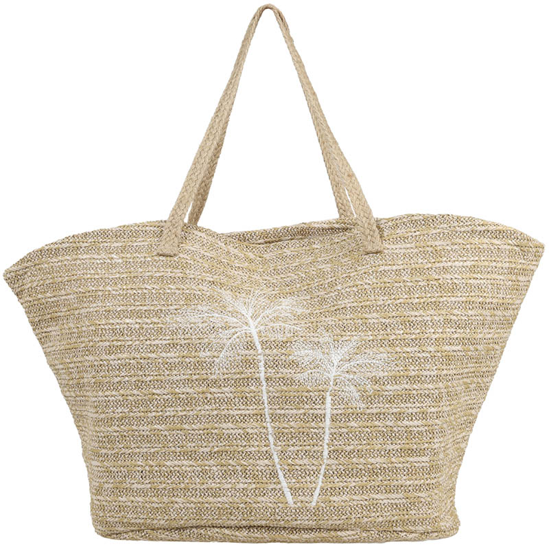 Romslig veske i slitesterkt, strålignende materiale, med dekorativt palmebroderi. Vesken er fuktbestandig og rommer alt du trenger til stranden – fra solkrem til håndkle – samtidig som den er like stilig til hverdagsbruk.