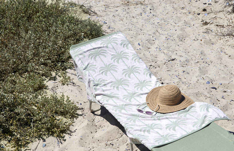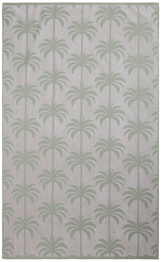 Strandhåndkleet har et dekorativt palmedesign i grønne toner mot en rosa bunnfarge, som gir et sommerlig og avslappet uttrykk.