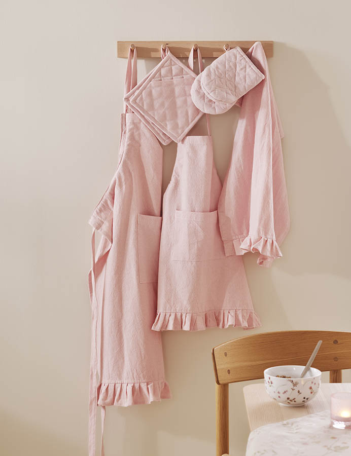 Vattert grytevott i slitesterk chambray, med hempe til oppheng og kort skaft som gjør den enkel å ta av og på. Votten er laget av resirkulerte materialer, og den fine rosafargen tilfører kjøkkenet et friskt og vårlig preg.