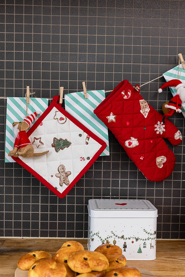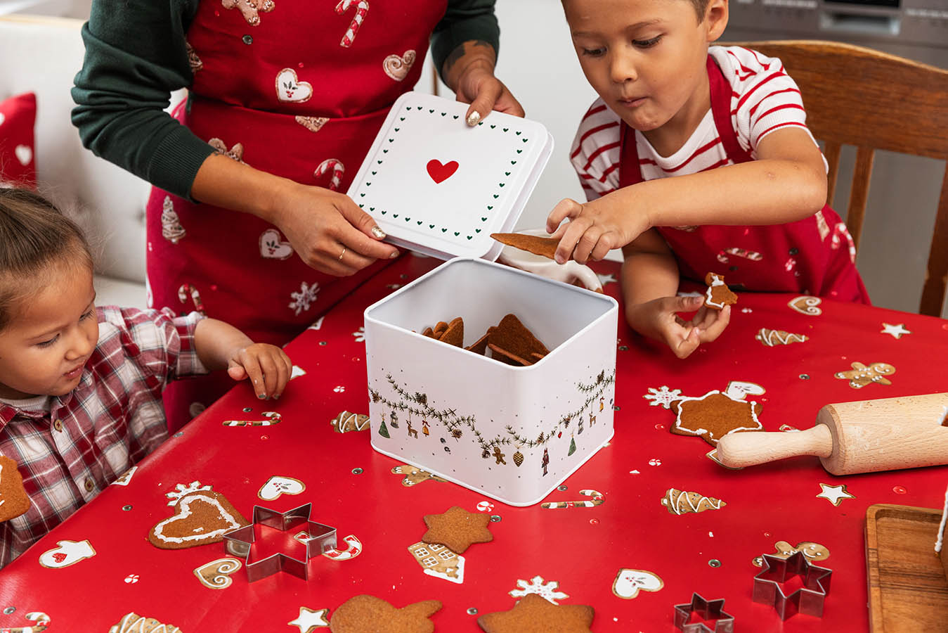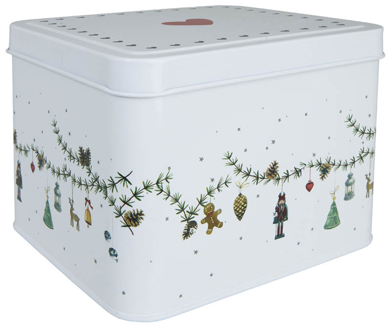 Nydelig kakeboks dekorert med en pyntet girlander og klassiske juleornamenter. Perfekt til å oppbevare høytidens julebakst, enten det er pepperkaker, lussekatter eller andre småkaker. Et design som vekker nostalgi og tilfører kjøkkenet en ekstra dose julestemning.