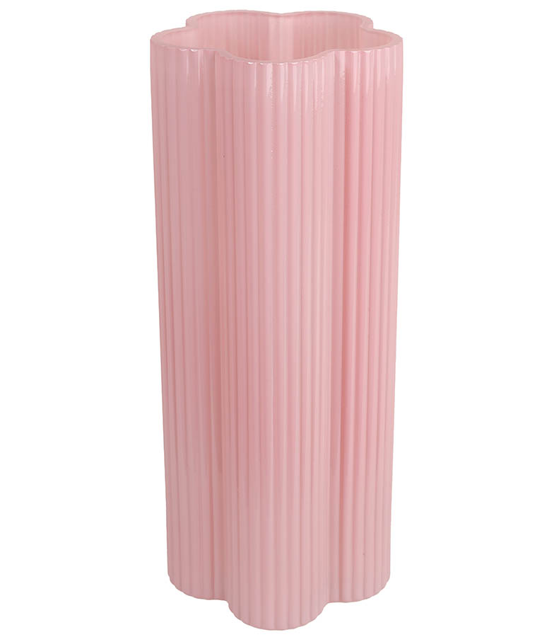 Blomsterformet vase i rosa glass med dekorativt rillemønster. Perfekt til buketter med snittblomster eller dekorative strå. Den lekne formen tilfører rommet liv og et vårlig preg.