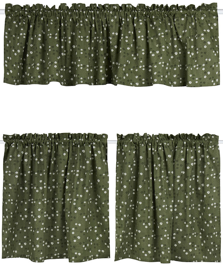 Søte cafégardiner med grønn bunnfarge og småblomstret mønster. Designet skaper en koselig atmosfære både hjemme og på hytta. Gardinsettet består av en kappe og to undergardiner. Alle fagene har løpegang og kan tres direkte på stangen.