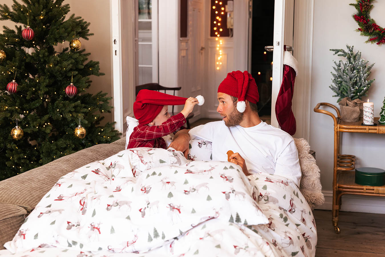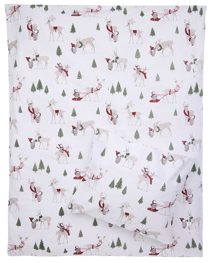 Julesengesett laget i myk og lun bomullsflanell. Sengesettet er trykket med et eventyrlig vintermotiv med nisser, reinsdyr og grantrær i et snødekt landskap – stemningsfulle detaljer som gjør julefeiringen ekstra koselig for både store og små. Perfekt for kalde vinterkvelder, magiske morgener og rolige stunder i juletiden.