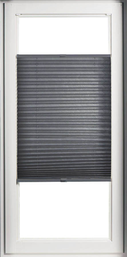 Plisségardin opp og ned i lett strukturert, enkelt stoff. Stoffet slipper inn lys og skjermer for innsyn. Gardinen er trådløs, betjenes med grep og kan skyves opp, ned eller samles på midten av vinduet – og blir stående i ønsket posisjon.