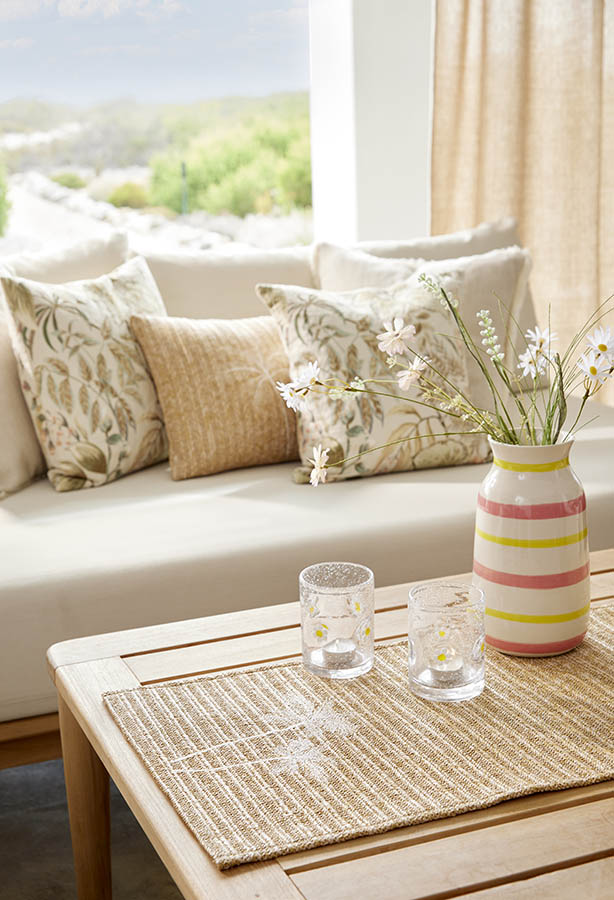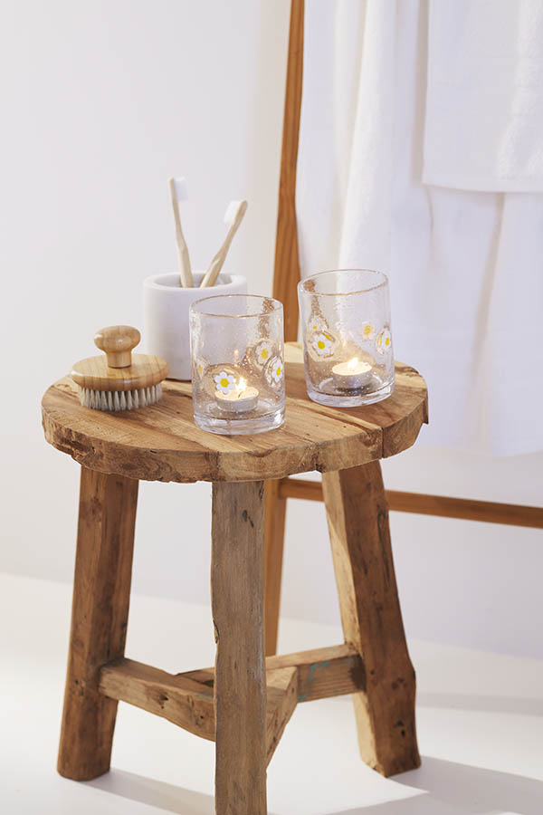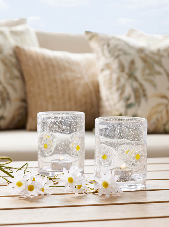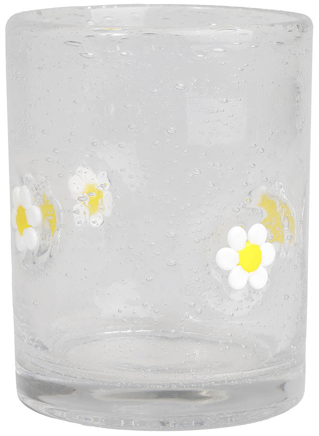 Lykt i glass prydet med prestekragemotiv og dekorative luftbobler. Det søte designet gir en herlig sommerfølelse, mens boblene i glasset skaper et vakkert og levende lysspill på bordet.