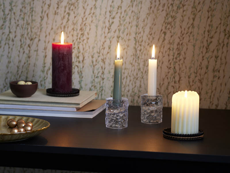 Lysfat i tykt, farget glass med et elegant rillemønster. Fatet passer til kubbelys med en diameter opptil 8 cm, og gir et stilfullt preg til ethvert rom. Det kan også brukes som en dekorativ skål for smykker, ringer eller småting.