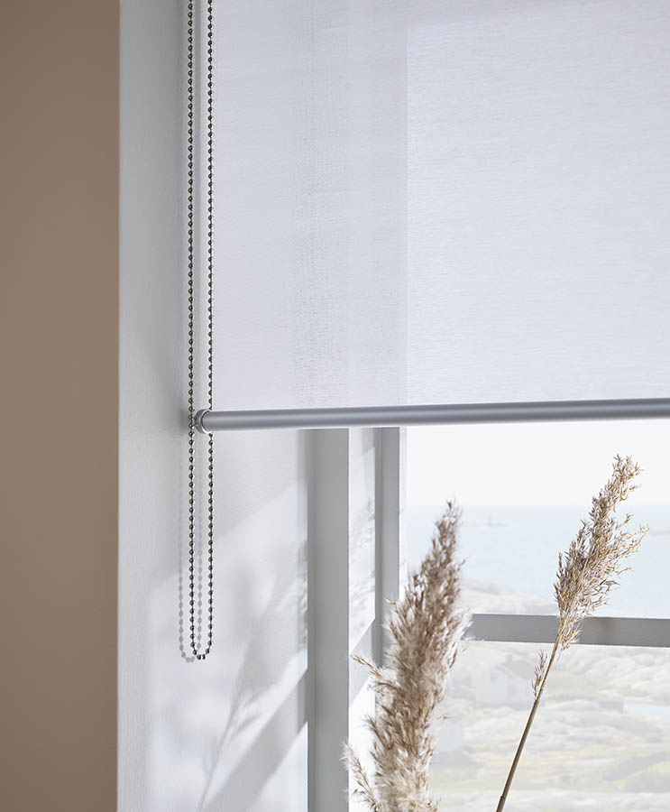 Rullegardinen betjenes med kjedetrekk, er underrullet og har ekstra lengde, slik at den også passer til høye vinduer. Aluminiumslisten nederst gir gardinen tyngde og et pent fall, samtidig som den fungerer som en stilren detalj.
