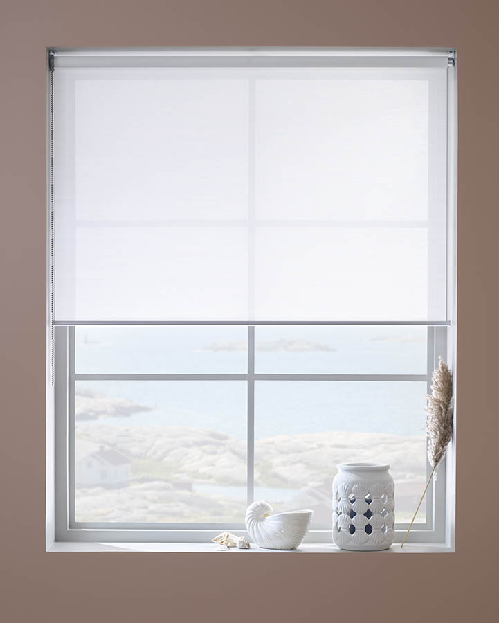 Stilren rullegardin i transparent screen-tekstil. Den lysfiltrerende tekstilen reduserer blending og innsyn, samtidig som den lar deg nyte utsikten. Perfekt til rom hvor du ønsker dagslys og behagelig solskjerming – som stue, kjøkken eller kontor.