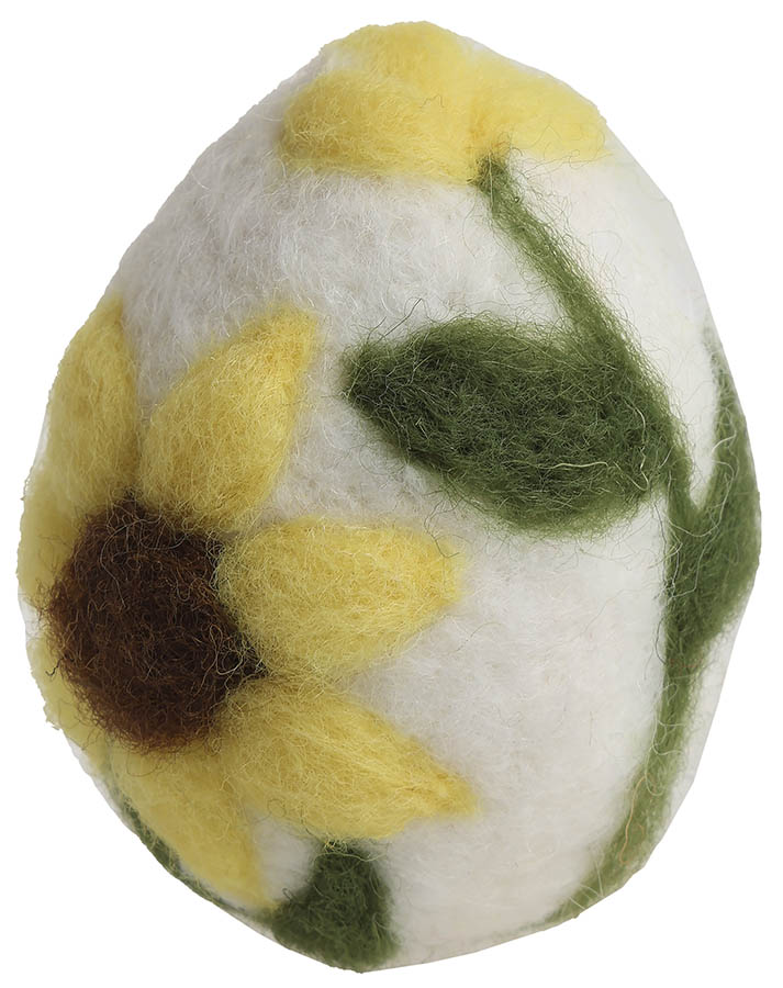Koselig påskeegg i filt, med dekorative solsikker som gir et varmt og vårinspirert uttrykk i påskedekoren.