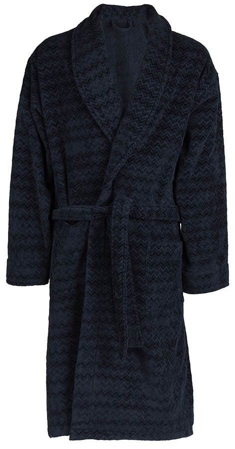 Jacquardvevd badekåpe med tidløst sikksakkmønster. Badekåpen er laget i ekstra tykk og slitesterk bomullsfrotté. Lang modell med krage, dype lommer og belte til knyting. Kommer i One size, som tilsvarer ca. L-XL i herrestørrelse.