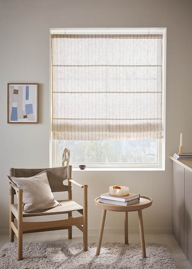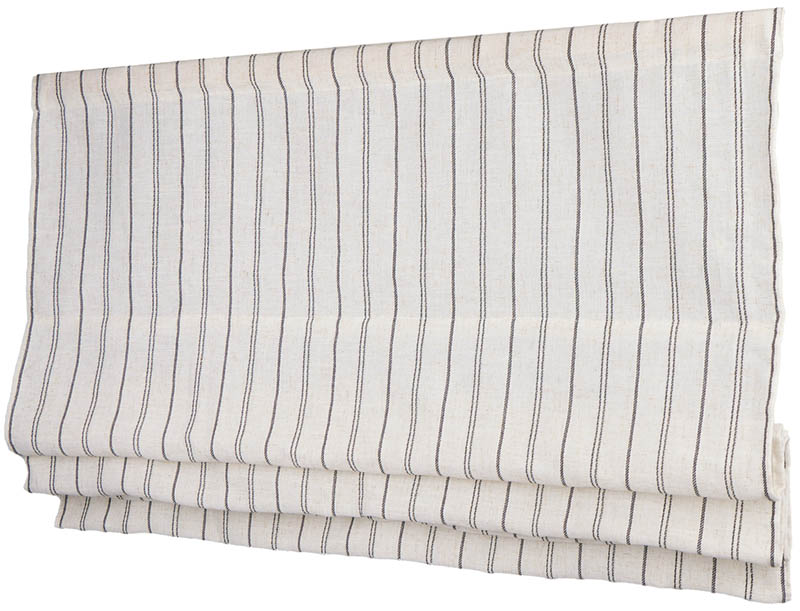 Mellomtykk liftgardin med svarte striper naturfarget bunn. Stoffet har innslag av lin som gir gardinen en fin tekstur og et naturlig preg.