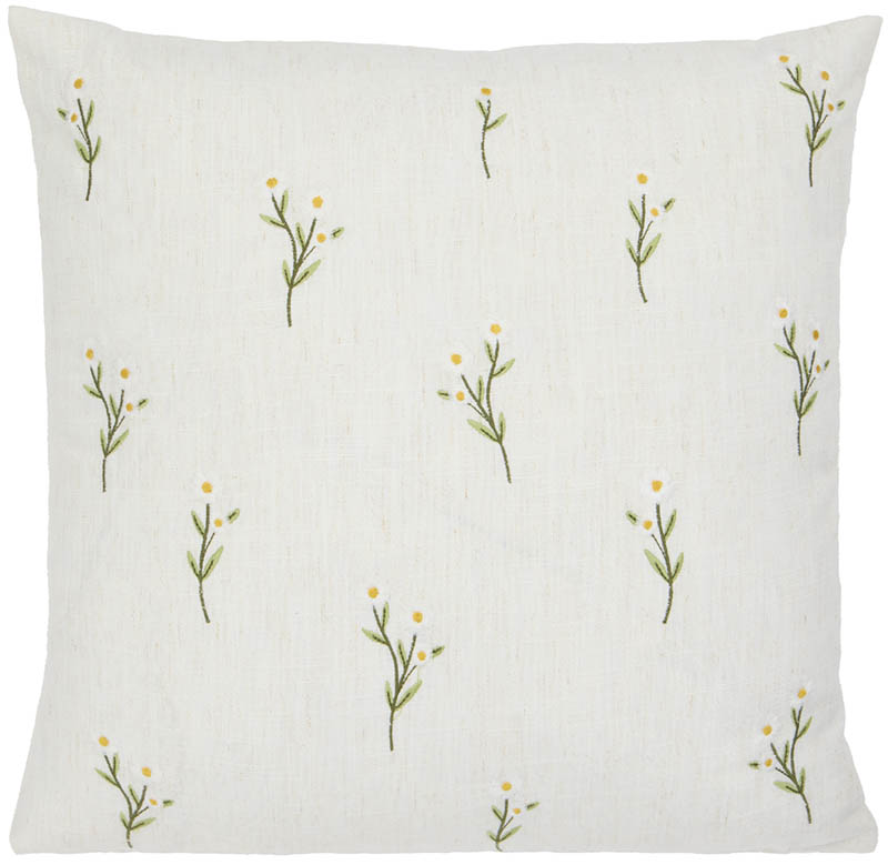 Naturfarget putetrekk med broderte blomster. Stoffet har innslag av lin som tilfører tekstur og en naturlig, lett røff overflate. Det nostalgiske, håndverksinspirerte designet gir en følelse av vår og blir et vakkert blikkfang i interiøret – enten hjemme eller på hytta.