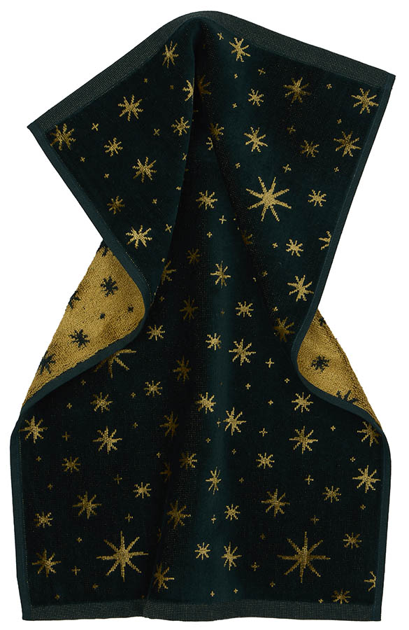 Eksklusivt gjestehåndkle i mørkegrønn velour, vevd i en myk blanding av bomull og modal. De vevde gullstjernene gir et elegant og skimrende uttrykk – perfekt for å gi badet et festlig preg til jul.