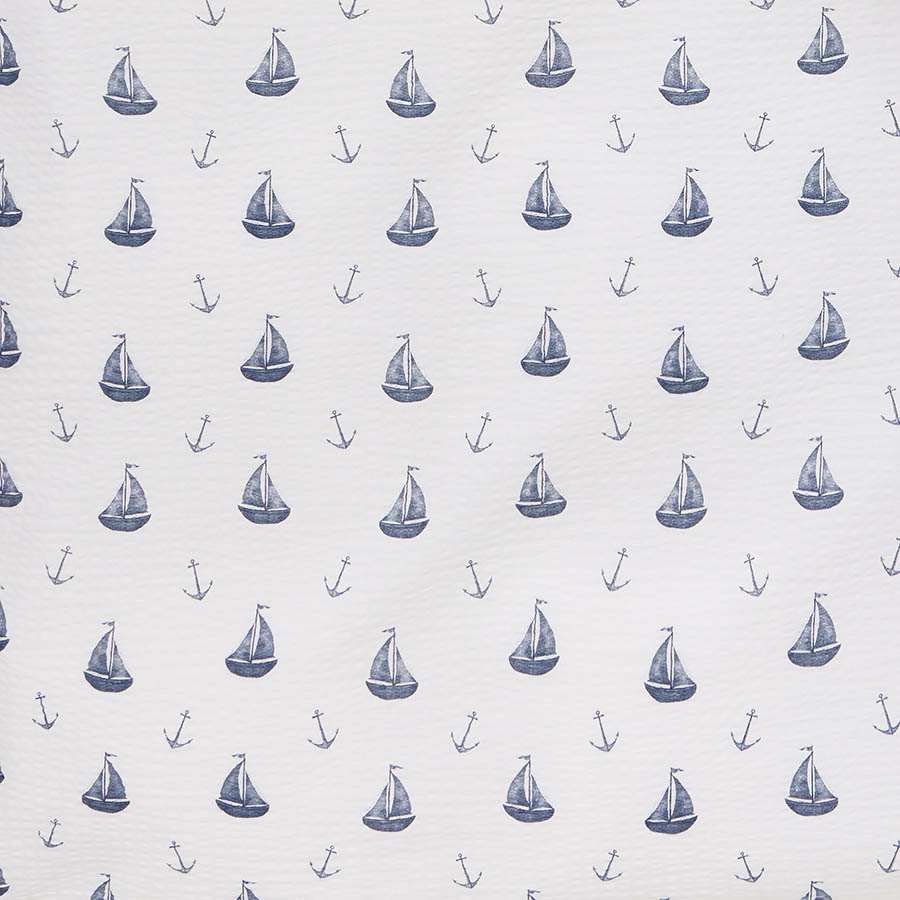 Svalt og luftig sengesett i bomullskrepp. Sengesettet har hvit bunnfarge og er trykket med seilbåter og ankere i marineblå og beige toner. Designet gir en herlig sommerfølelse på soverommet og passer perfekt for deg som ønsker en maritim stil. Perfekt både hjemme og på hytta, uansett årstid.