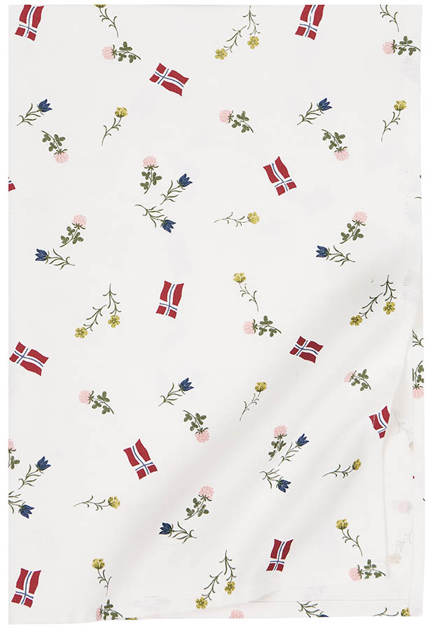 Stor bomullsduk trykket med markblomster og norske flagg – perfekt for å skape stemning til 17. mai, konfirmasjon, dåp og andre feiringer. Den store størrelsen gjør den ideell når du vil dekke et vakkert festbord.