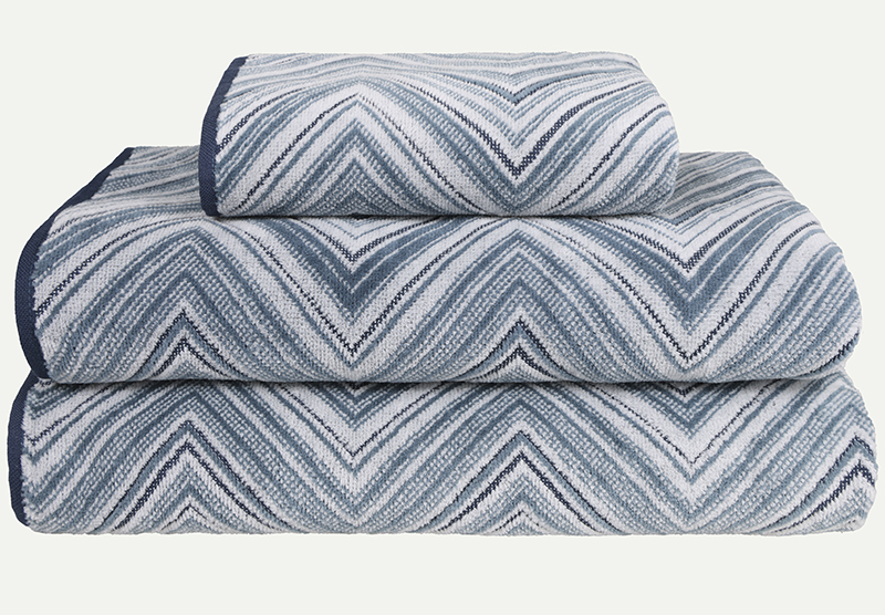 Stilig håndkle i mellomtykk bomullsfrotté med god absorberingsevne. Det dekorative sikksakkmønsteret i blå nyanser gir et livlig blikkfang og frisker opp badet.