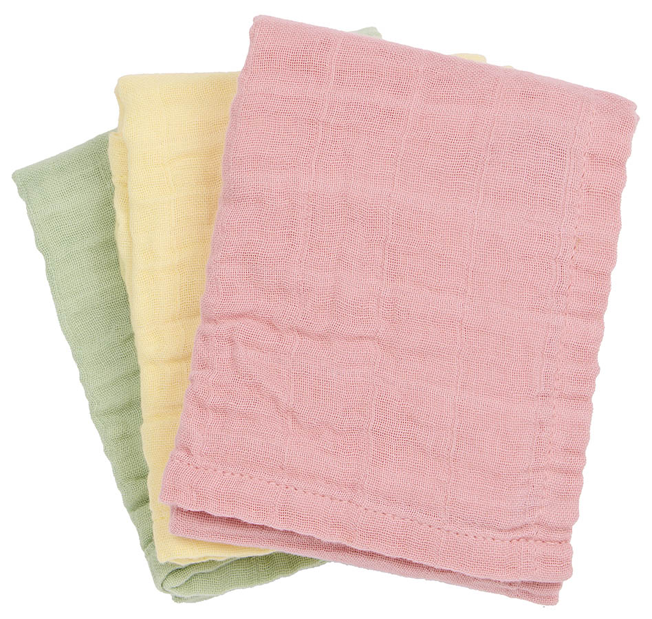 Tini musselinklut 45x45 3pk rosa/grønn/gul