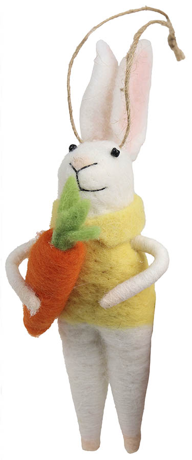 Søt harepus i filt som holder en gulrot. Figuren kan henges opp og gir et koselig og lekent innslag i påskepynten.