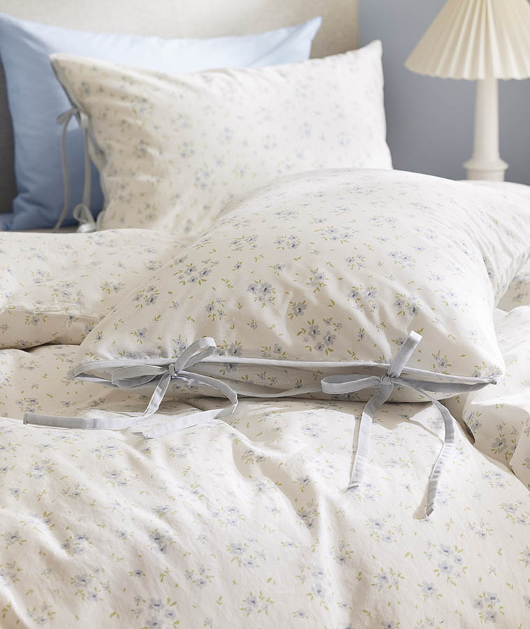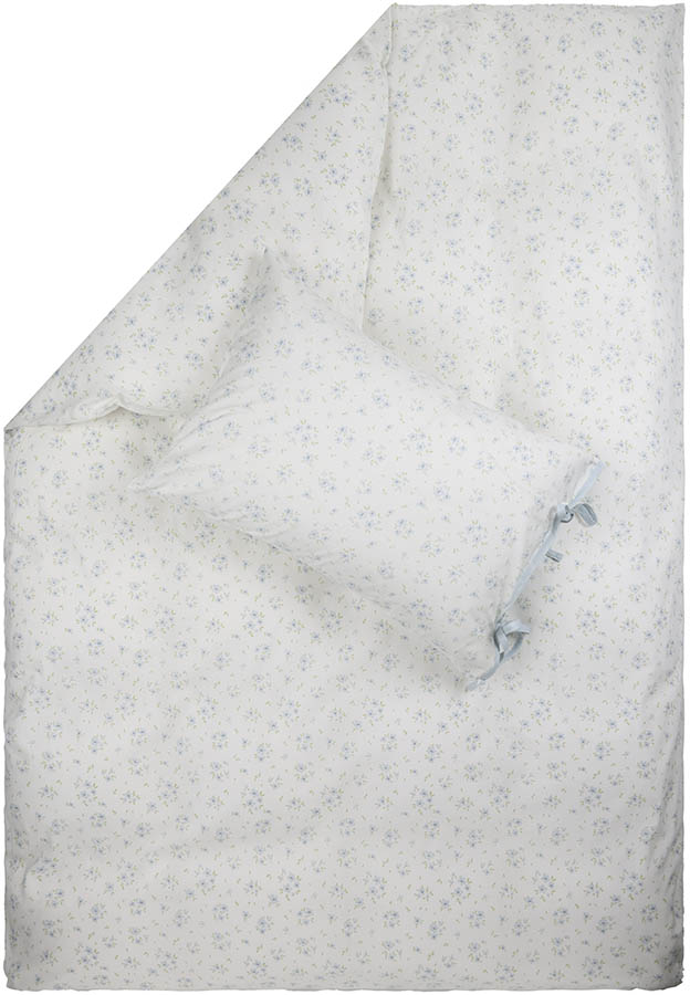 Mykt og slitesterkt sengesett i bomull. Sengesettet har et søtt blomstermønster i blåtoner, og putevaret lukkes med fine knytebånd på siden – en unik detalj som gir det lille ekstra. Designet gir en nostalgisk, vårlig følelse, og sengesettet passer like godt på hytta som hjemme.