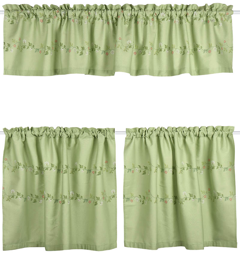 Grønne cafégardiner med vakre blomsterranker. Den friske fargen og det søte mønsteret gir kjøkkenet en sommerlig følelse, og passer like fint på hytta som hjemme.