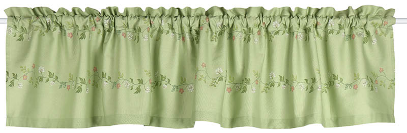 Grønn gardinkappe med vakre blomsterranker. Den friske fargen og det søte mønsteret gir rommet en sommerlig følelse, og passer like fint på hytta som hjemme.