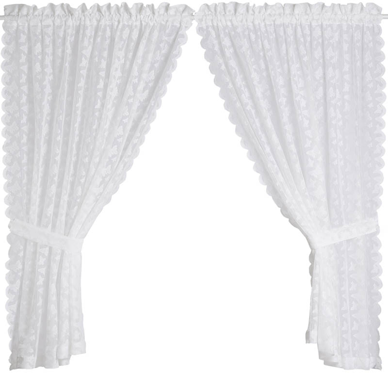 Søte gardiner med vevd sommerfuglmønster. Gardinene har løpegang og rynkehode. Settet består av to gardiner og to gardinholdere. Fine på både kjøkken og soverom.