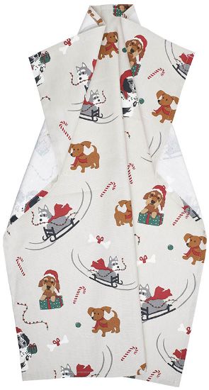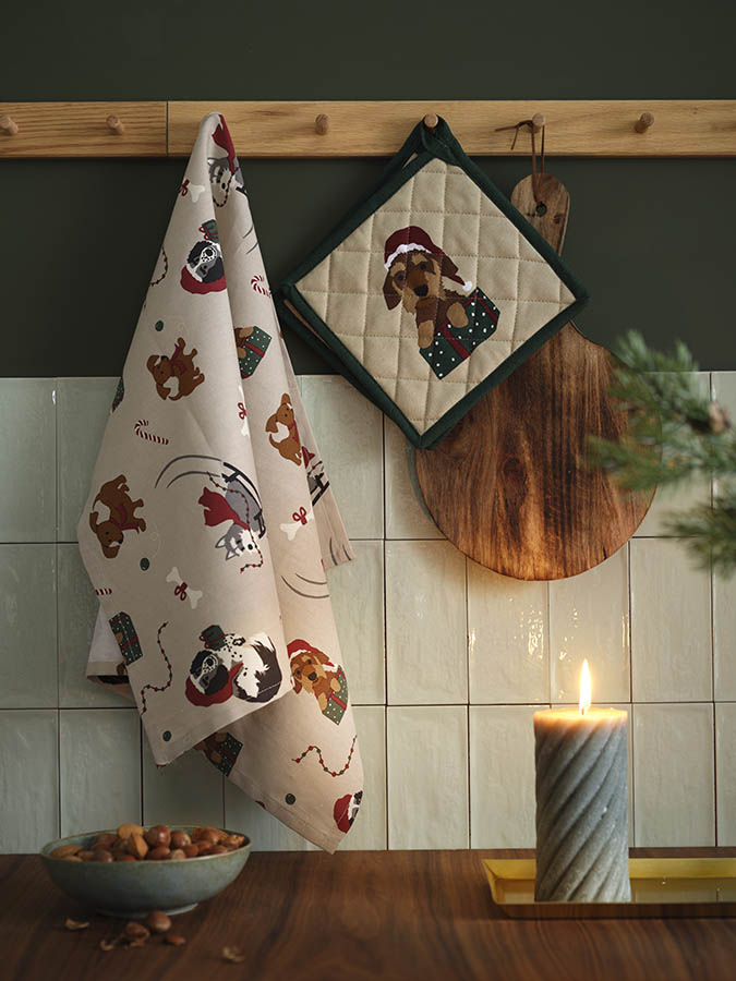 I jula samles vi gjerne på kjøkkenet for å skape gode minner, og med julemønstrete kjøkkentekstiler blir det ekstra koselig. Twister kjøkkenhåndkle er trykket med søte hunder i julestemning – et design som sprer glede og gir kjøkkenet et lekent og hjertevarmt preg.