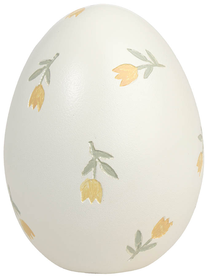 Dekorativt påskeegg pyntet med gule blomster. De myke formene og de fine detaljene gir egget et lyst og vårlig uttrykk som tilfører påskedekoren en rolig og elegant stemning. Egget passer fint som påskepynt alene eller sammen med andre dekorative elementer.