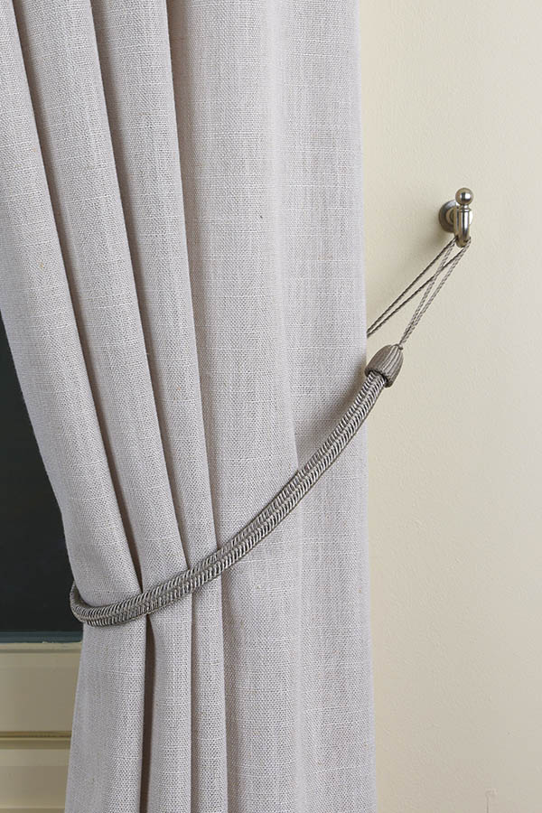 Grå gardinholder i stilrent design. Gardinholderen tres rundt gardinen og brukes sammen med en omtakskrok for å holde gardinen til siden i vinduet. Den sørger for at gardinen holdes på plass, samtidig som den rammer inn vinduet på en elegant måte. Kan brukes til alle typer gardinlengder.