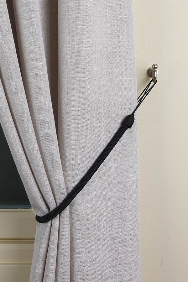 Svart gardinholder gardinholder i stilrent design. Gardinholderen tres rundt gardinen og brukes sammen med en omtakskrok for å holde gardinen til siden i vinduet. Den sørger for at gardinen holdes på plass, samtidig som den rammer inn vinduet på en elegant måte. Kan brukes til alle typer gardinlengder.