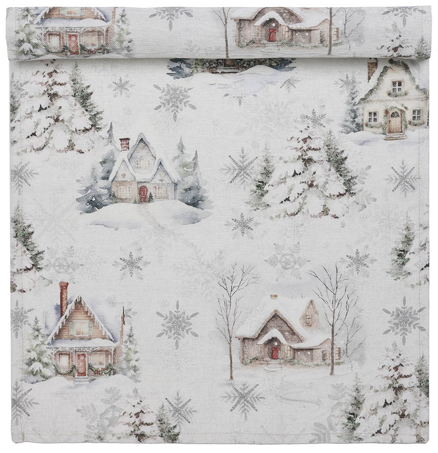 Liten juleløper med et vakkert motiv av en snødekket vinterlandsby. Designet er inspirert av nordisk natur, og de invevde sølvtrådene gir en diskret, glitrende effekt som skaper en magisk julestemning. Perfekt størrelse til sidebord, stuebord eller mindre kjøkkenbord. Kombiner gjerne med andre produkter fra samme serie.