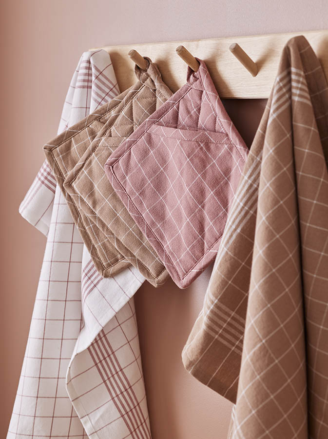 Rosa strikkeklut i slitesterk bomull. Praktisk og dekorativ på kjøkkenet.