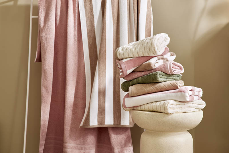 Stilig håndkle med brede beige striper. Kommer i garnfarget bomull med myk velour på forsiden, og absorberende frotté på baksiden. Tidløs design som kler de fleste bad.