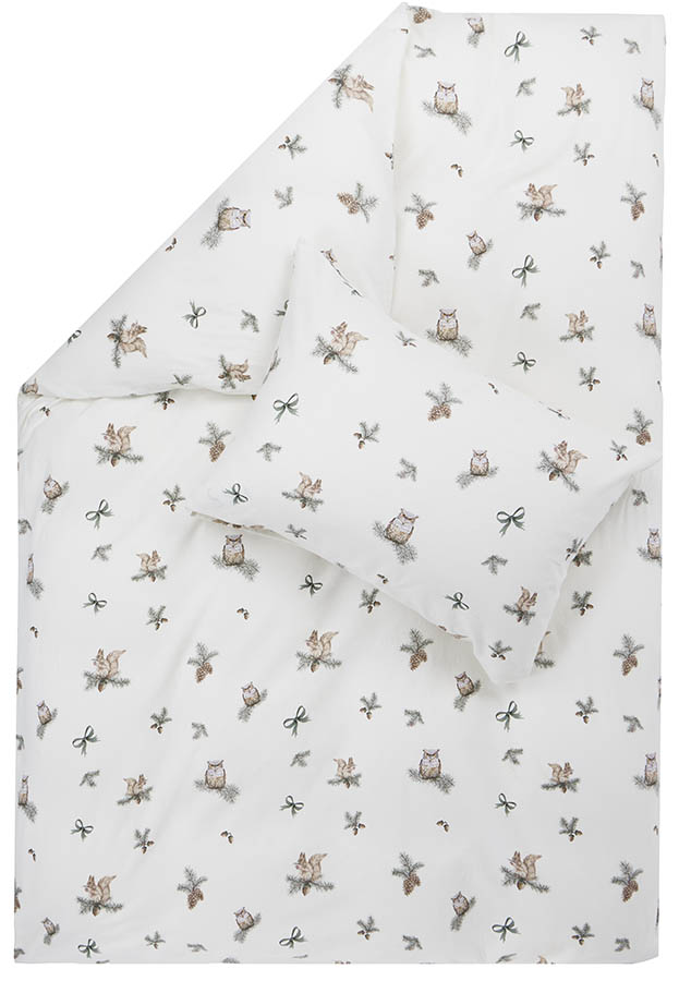 Mønstret sengesett i myk bomullsflanell. Det koselige mønsteret med ugler, ekorn, kongler og kvister skaper en rolig atmosfære i harmoni med naturen, mens den børstede flanellen føles lun og behagelig mot huden. Perfekt for deg som vil ta med skogens ro inn på soverommet – hjemme eller på hytta.