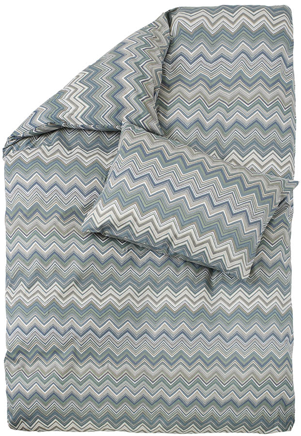 Sengesett i myk bomull. Har et stilig sikksakkmønster i svale toner. Kombiner gjerne med putevar og laken i matchende farger.