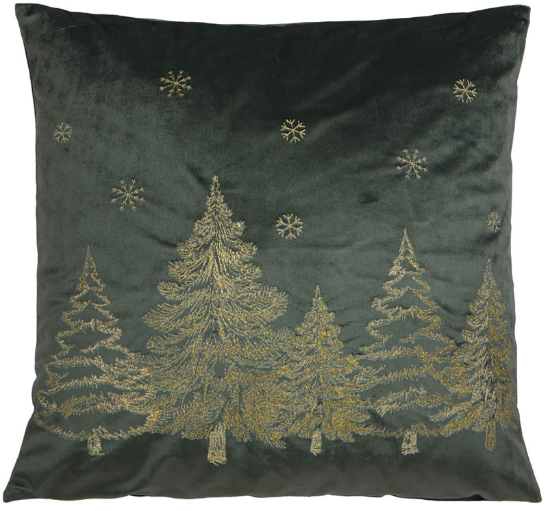 Mørkegrønt putetrekk i myk velour, brodert med et vakkert motiv av juletrær og stjerner i gull. Perfekt for deg som ønsker et klassisk uttrykk i julehjemmet. Det forseggjorte motivet skaper garantert julestemning –  enten du bruker det som pyntepute i sofaen eller sengen. Kombiner gjerne med løperen fra samme serie.