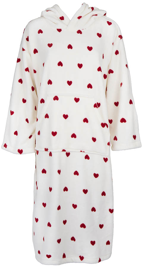 Myk og koselig poncho med søtt hjertemønster. Laget av behagelig fleece, med hette og stor lomme på magen. Kommer i størrelse One size, som tilsvarer S–L i damestørrelse. Perfekt som koseplagg for både voksne og ungdom.